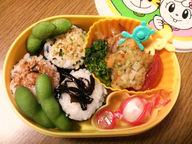上にはたまごと梅のふりかけにゴマ昆布を乗せます。
