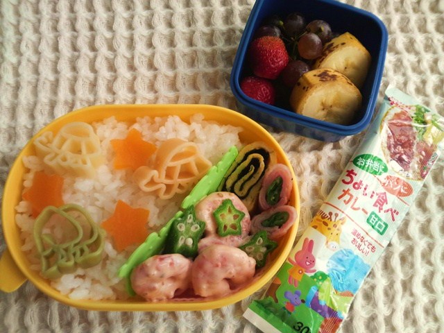 白いご飯の上には星の人参と動物のマカロニを乗せました。