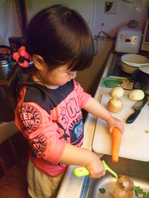 器用にピーラーで人参の皮を剥くリホコ。