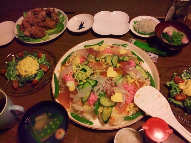 スナップえんどうと三つ葉、てまり麩を入れてみました。