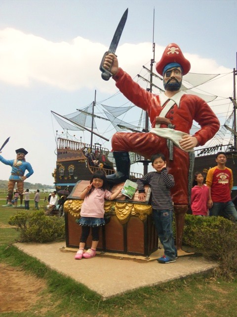海賊船の前でパチリ。